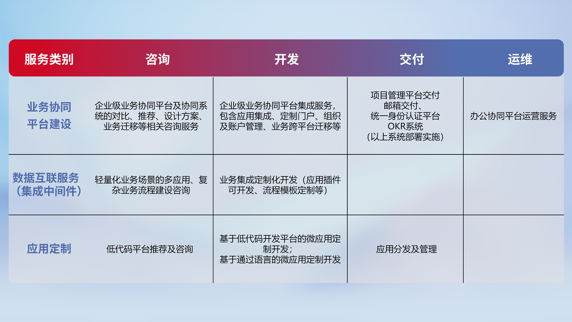 针对钉钉、、企微、、IDaas等平台级产品提供产品的规划、、、方案、、、、交付、、、定制化开发等服务,,,,实现如统一协同办公、、智能客户服务、、、、混合会议管理、、智能数据查询、、、、等业务场景,,实现数字化转型。。。